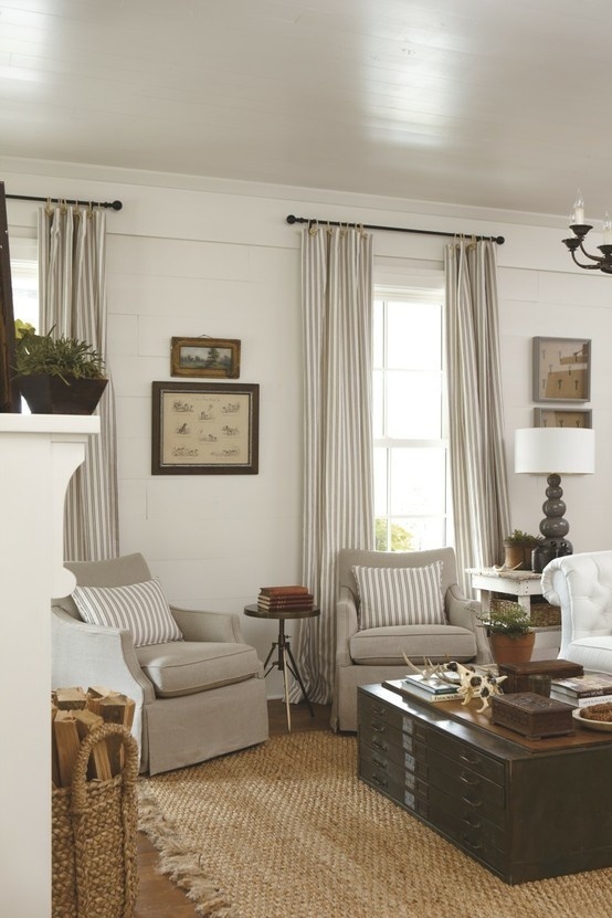 比如這張圖里地毯與茶幾顏色過于“大面積”所以都不適合作為窗簾顏色的參照色,但如果是和灰白條紋的沙發(fā)抱枕保持一致就毫不違和。而且也符合上文提到的比墻面顏色要深一點(diǎn)的準(zhǔn)則。