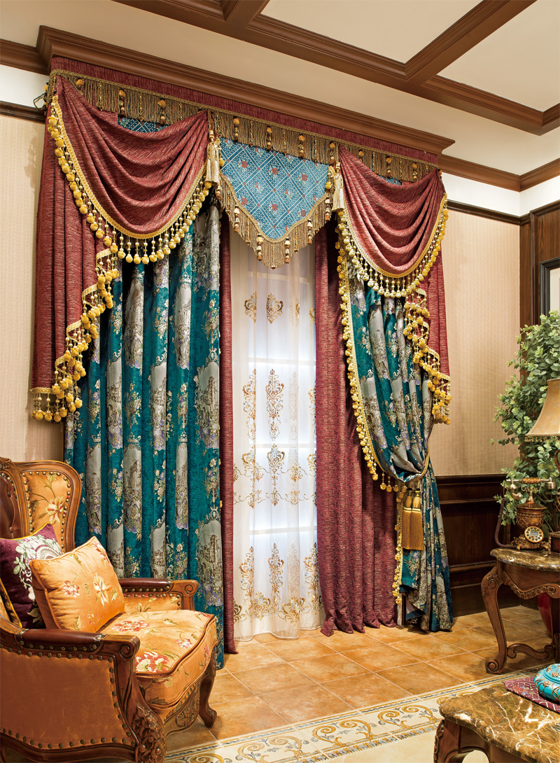 花型、色彩及款式:融合各種歐式花卉及卷草圖案。以金色調(diào)為主,酒紅、紫紅等為配色,搭配層次豐富的水波簾頭款式及歐式花邊進(jìn)行設(shè)計。(如:吊珠類花邊等)