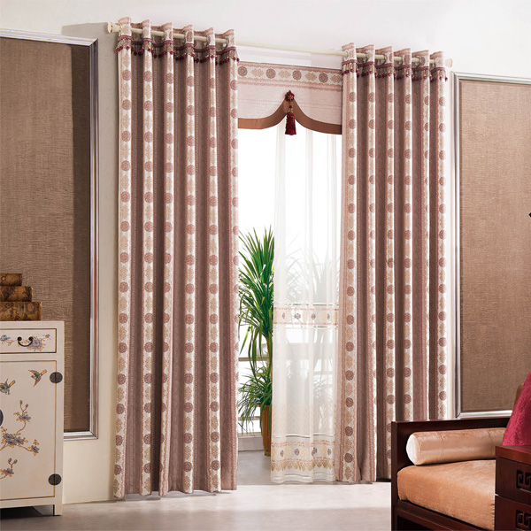花型、色彩及款式:花型上采用中國傳統(tǒng)的圖案(如:和氏壁、祥云、圍棋等),體現(xiàn)中國美學(xué);以棕色調(diào)、米色調(diào)為主,款式可采用直線造型的平過簾頭、水波簾頭或二者相結(jié)合的形式。