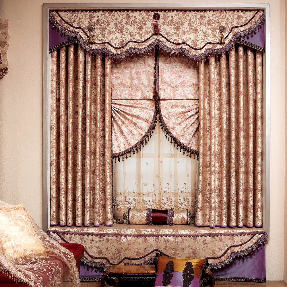 花型、色彩及款式:花型上采用中國傳統(tǒng)的圖案(如:和氏壁、祥云、圍棋等),體現(xiàn)中國美學(xué);以棕色調(diào)、米色調(diào)為主,款式可采用直線造型的平過簾頭、水波簾頭或二者相結(jié)合的形式。